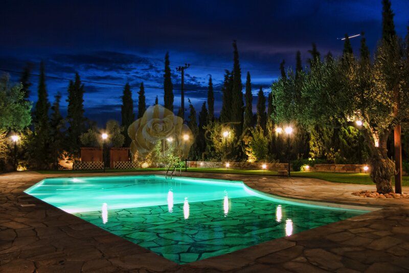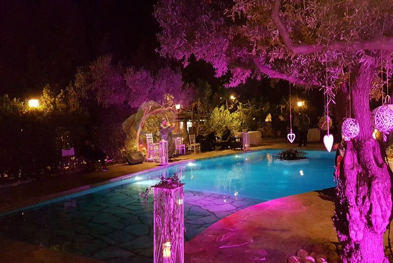 Poolside Velli (400 καθήμενοι) Ρομαντικό δείπνο στον ελαιώνα κάτω από το φως των φαναριών που κρέμονται στα αιωνόβια δέντρα και τη θέα της πισίνας να σας ταξιδεύει...